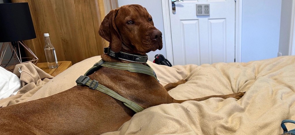 The next morning, strong winds with 30mph gusts caused our awning to start separating from the caravan. We had to frantically empty its contents and take it down in high winds, creating a lot of noise and chaos. While we were finishing packing away tables and chairs, Dozer was let out to investigate. Unfortunately, in the mess, I accidentally trapped my finger in a folding table, causing a painful injury to my finger and blood to pour everywhere. Dozer became stressed and began to jump up at me almost trying to climb up me after sniffing all of the blood. The following night brought another storm, and yesterday morning, we embarked on a long five-hour drive to Southampton through horrendous weather. Arriving late at the hotel, Dozer, who had never been in a hotel before, couldn’t settle down. He spent most of the night pacing and grumbling at every noise.